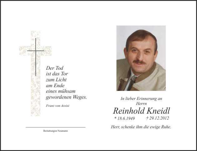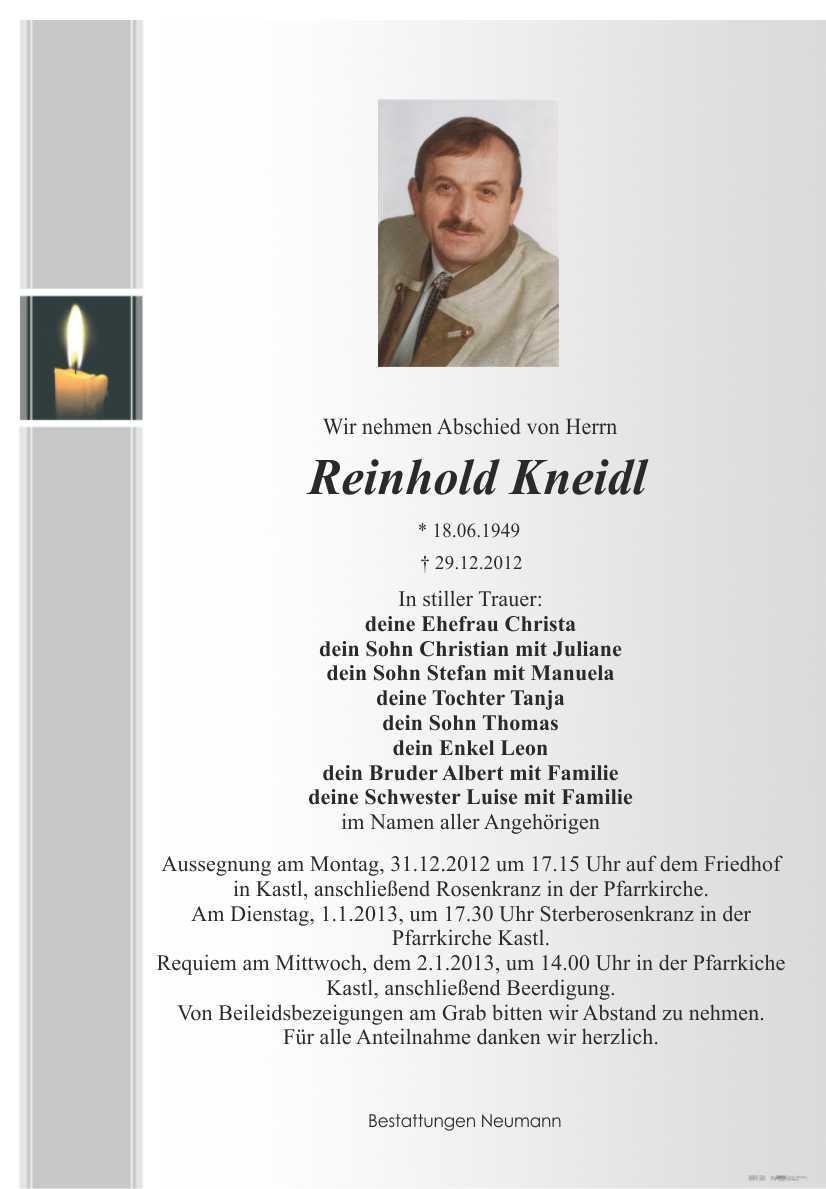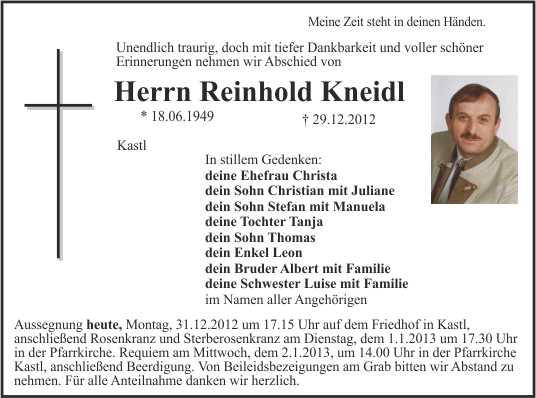 Aussegnung heute, Montag, 31.12.2012 um 17.15 Uhr auf dem Friedhof in Kastl, anschließend Rosenkranz und Sterberosenkranz am Dienstag, dem 1.1.2013 um 17.30 Uhr in der Pfarrkirche. Requiem am Mittwoch, dem 2.1.2013, um 14.00 Uhr in der Pfarrkirche Kastl, anschließend Beerdigung. Von Beileidsbezeigungen am Grab bitten wir Abstand zu nehmen. Für alle Anteilnahme danken wir herzlich.
