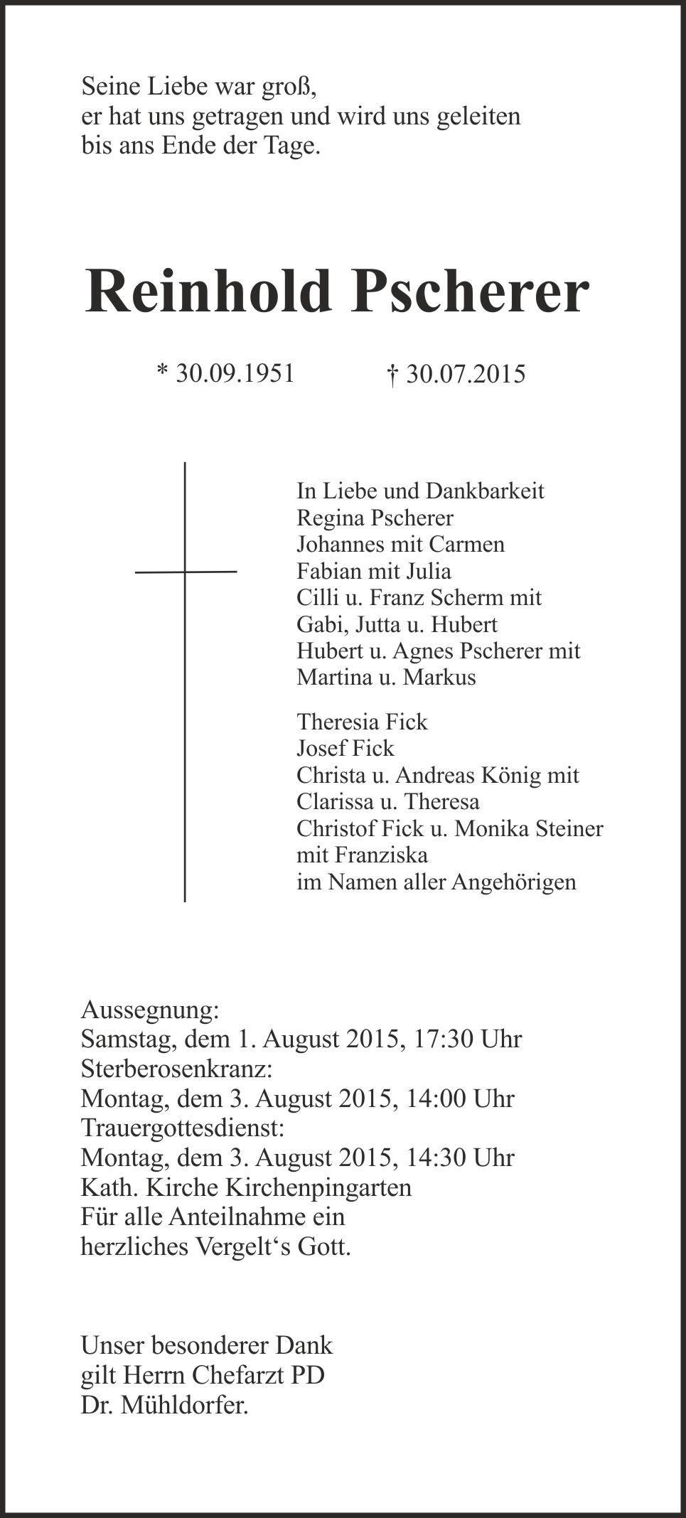 Rosenkranz am Montag, den 03.08.2015 um 14.00 Uhr in der katholischen Pfarrkirche Kirchenpingarten, Requiem um 14.30 Uhr, anschließend Beerdigung. Für alle Anteilnahme herzlichen Dank