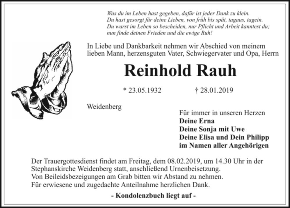 Der Trauergottesdienst findet am Freitag, dem 08.02.2019, um14.30 Uhr in der Stephanskirche Weidenberg statt, anschließend Urnenbeisetzung.