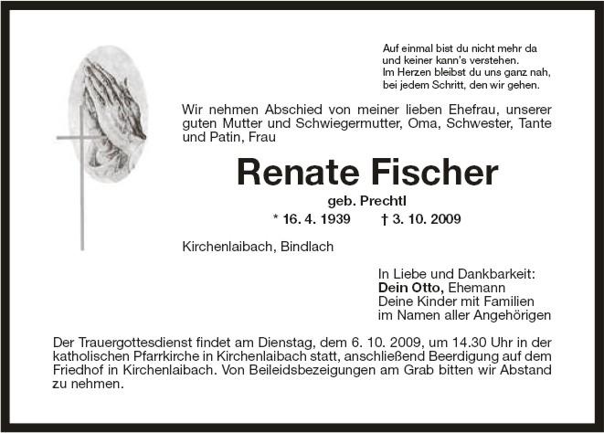 Der Trauergottesdienst findet am Dienstag, dem 6.10.2009 um 14.30 Uhr in der katholischen Pfarrkirche in Kirchenlaibach statt, anschließend Beerdigung auf dem Friedhof in Kirchenlaibach.