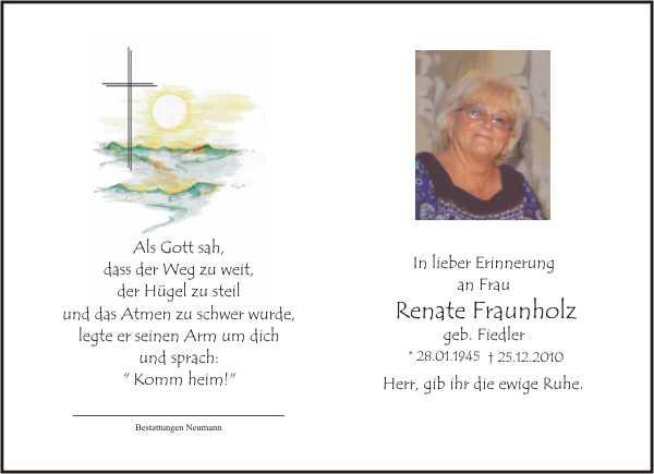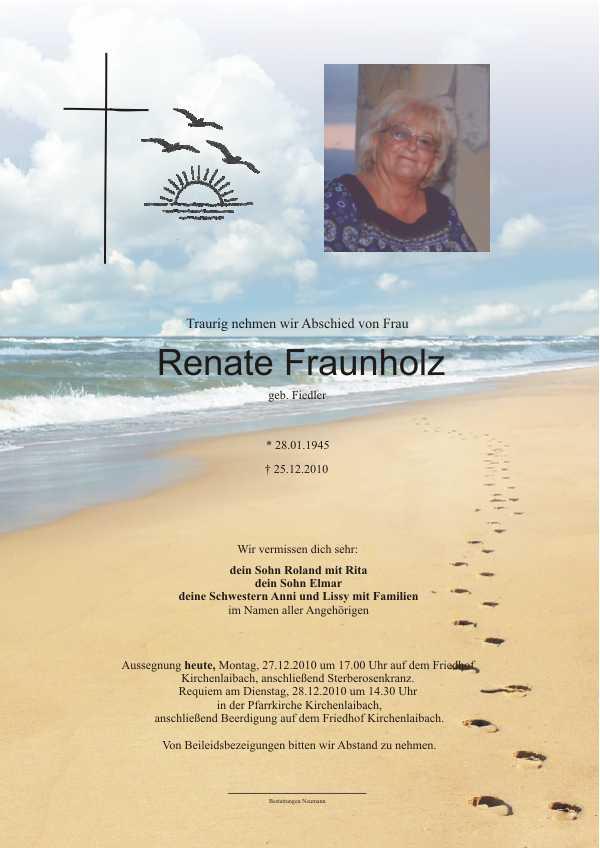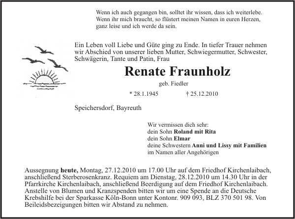 Die Beisetzung findet am Dienstag, 28.12.2010 um 14:30 Uhr auf dem Friedhof in Kirchenlaibach statt.