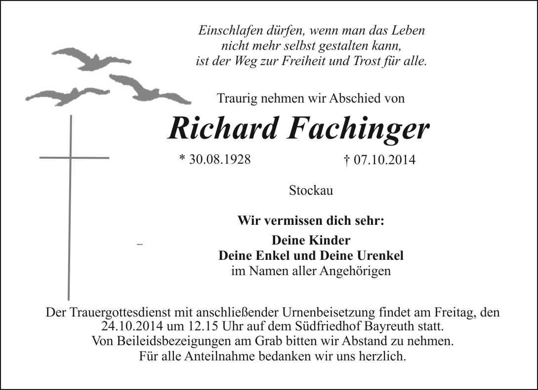 Der Trauergottesdienst mit anschließender Urnenbeisetzung findet am Freitag, den 24.10.2014 um 12.15 Uhr auf dem Südfriedhof Bayreuth statt.