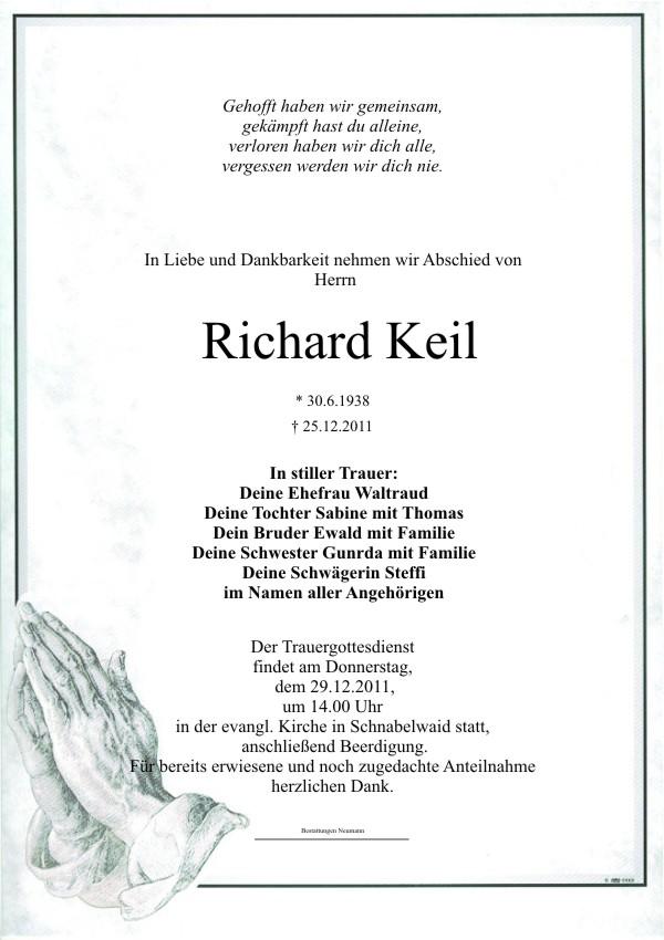 Der Trauergottesdienst findet am Donnerstag, dem 29.12.2011, um 14.00 Uhr in der evangl. Kirche in Schnabelwaid statt, anschließend Beerdigung.