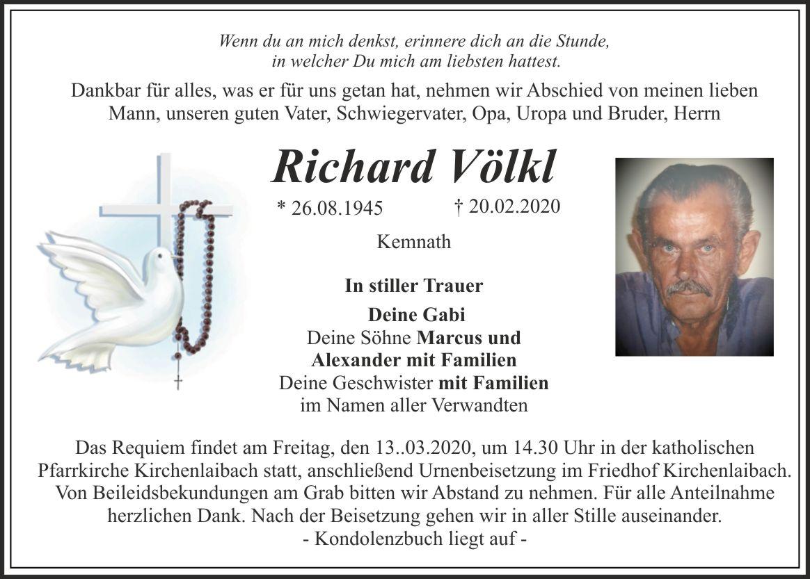 Das Requiem findet am Freitag, den 13..03.2020, um 14.30 Uhr in der katholischen Pfarrkirche Kirchenlaibach statt, anschließend Urnenbeisetzung im Friedhof Kirchenlaibach. Von Beileidsbekundungen am Grab bitten wir Abstand zu nehmen. Für alle Anteilnahme herzlichen Dank. Nach der Beisetzung gehen wir in aller Stille auseinander.