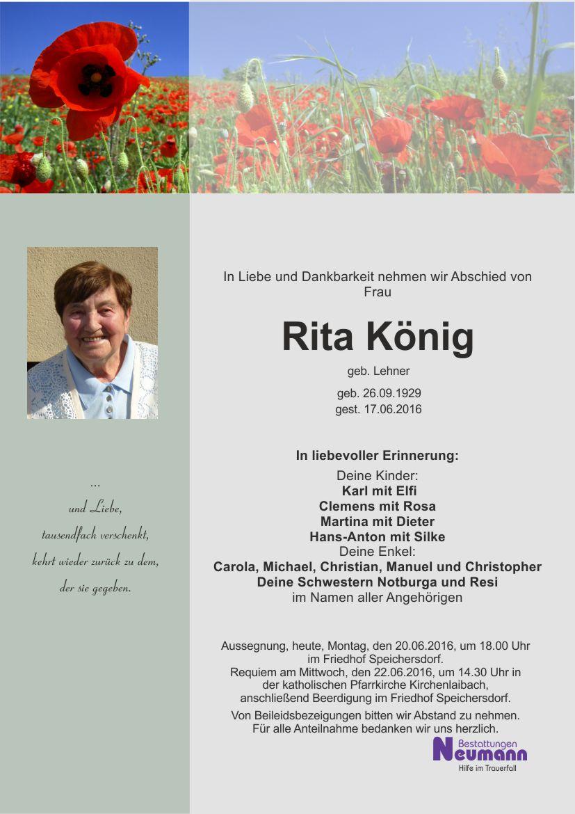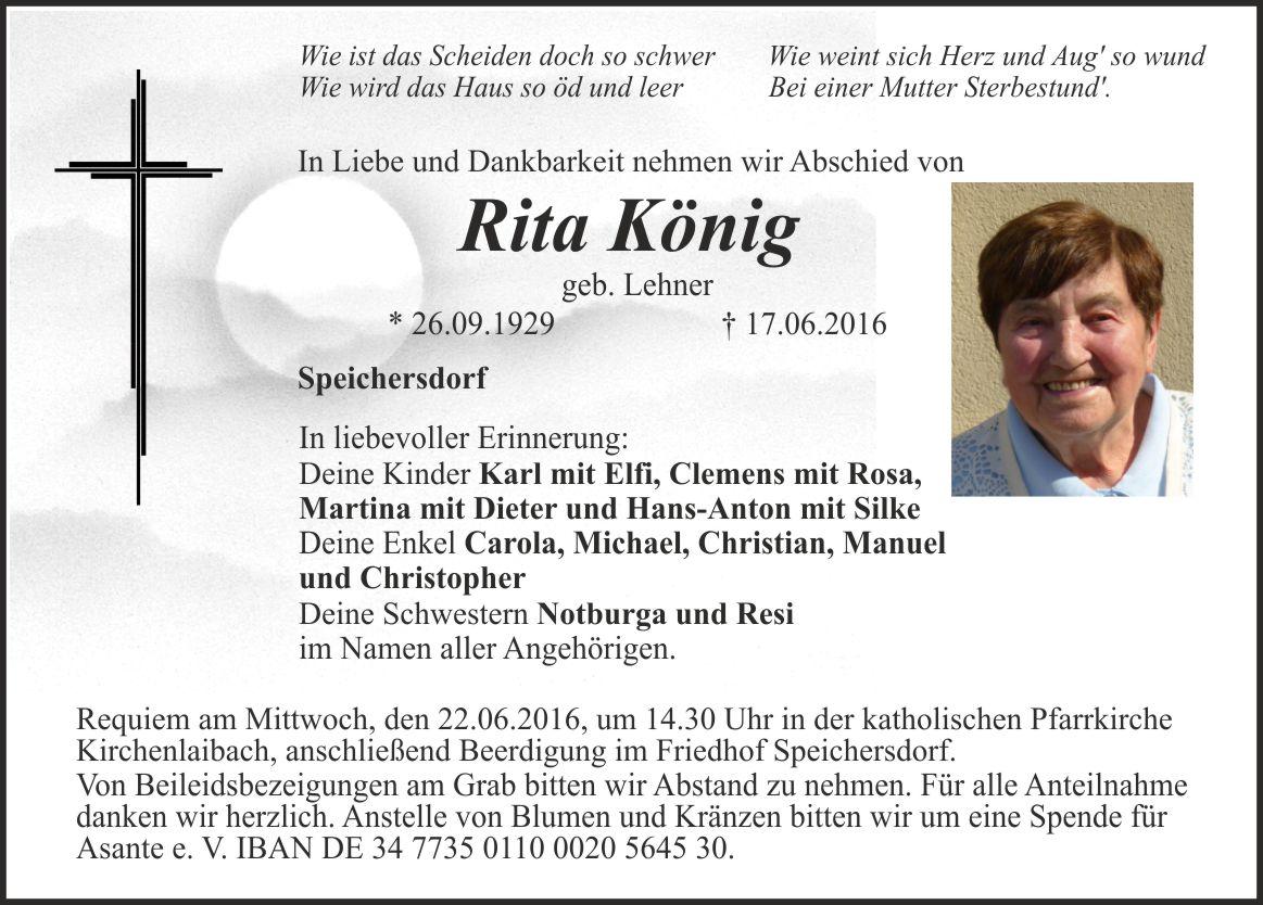Requiem am Mittwoch, den 22.06.2016, um 14.30 Uhr in der katholischen Pfarrkirche Kirchenlaibach, anschließend Beerdigung auf dem Friedhof in Speichersdorf. Von Beileidsbezeigungen am Grab bitten wir Abstand zu nehmen. Für alle Anteilnahme herzlichen Dank.