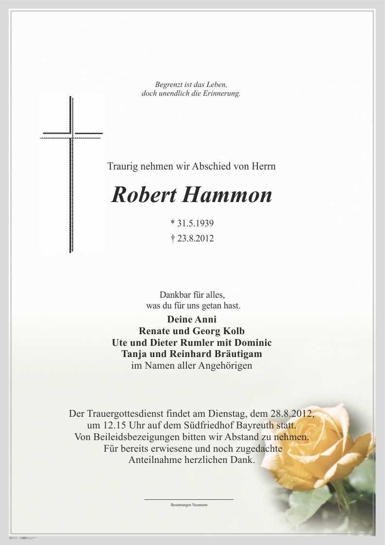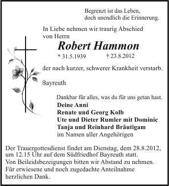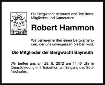 Der Trauergottesdienst findet am Dienstag, dem 28.8.2012, um 12.15 Uhr auf dem Südfriedhof Bayreuth statt.