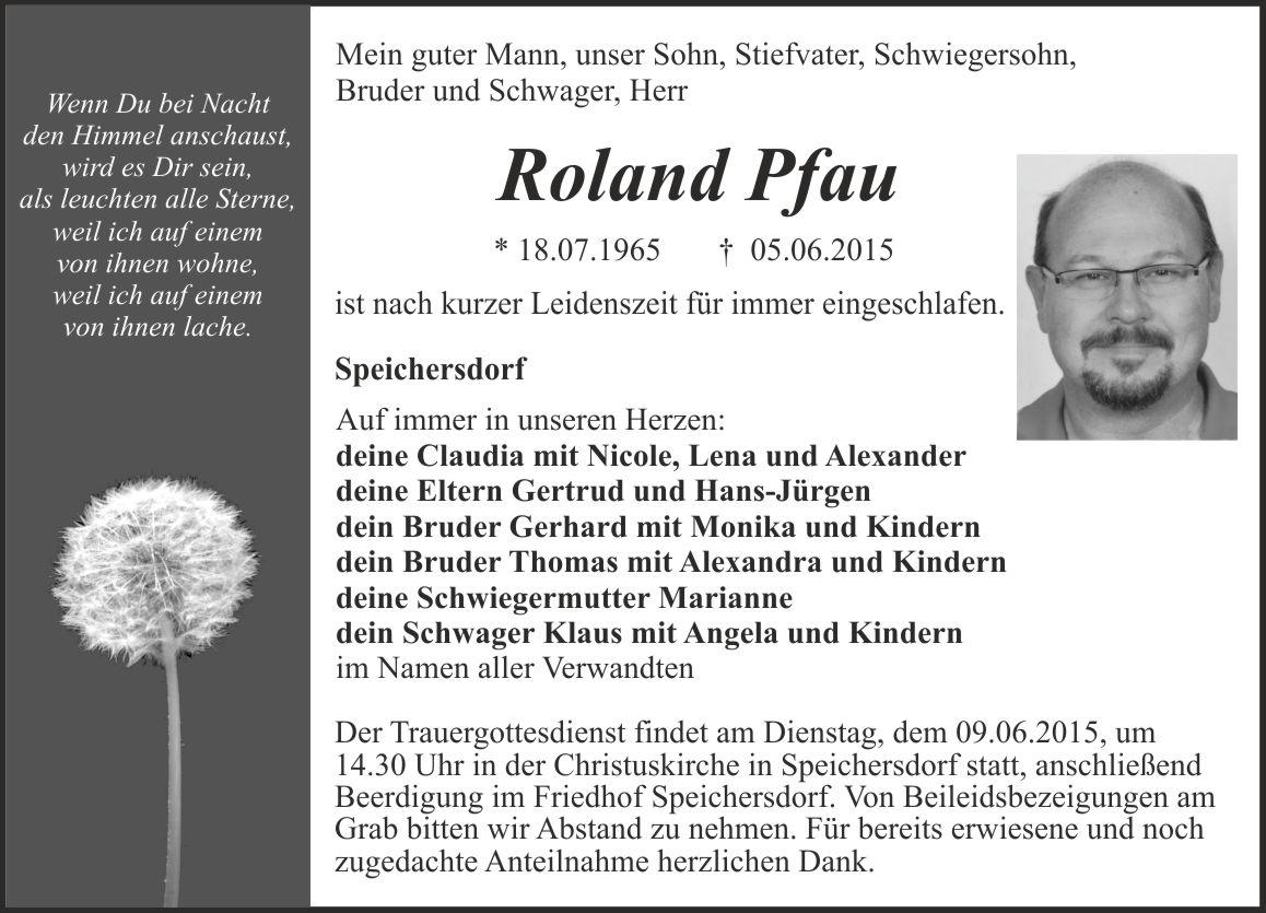 Der Trauergottesdienst findet am Dienstag, den 09.06.2015, um 14.30 Uhr in der Christuskirche Speichersdorf statt, anschließend Beerdigung im Friedhof Speichersdorf. Von Beileidsbezeigungen am Grab bitten wir Abstand zu nehmen. Für alle Anteilnahme bedanken wir uns herzlich. - Kondolenzbuch liegt auf -