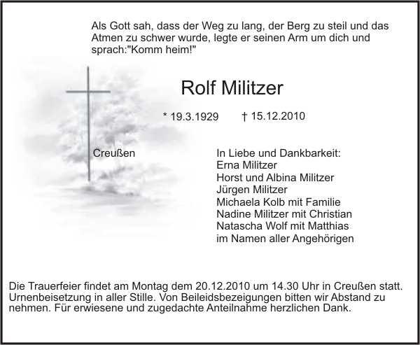 Der Trauergottesienst findet am Montag, 20.12.2010 um 14.30 Uhr in Creußen statt. Urnenbeisetzung in aller Stille.
