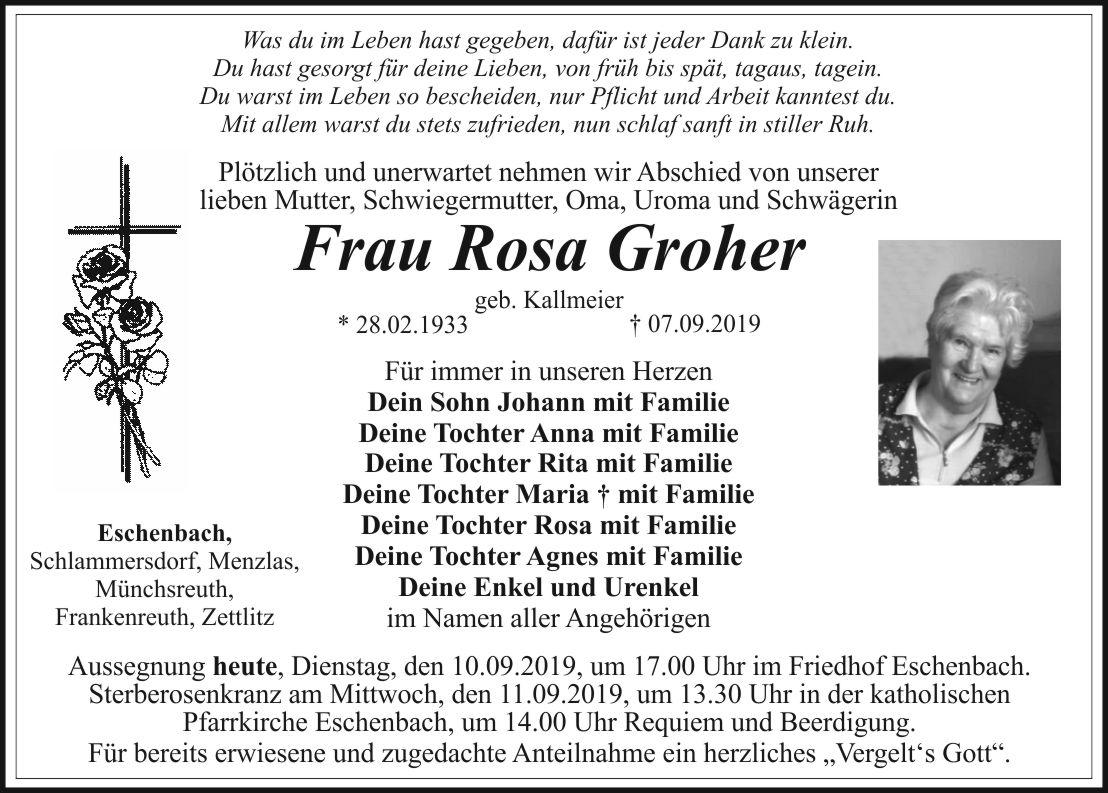 im Friedhof Eschenbach. Sterberosenkranz am Mittwoch, den 11.09.2019, um 13.30 Uhr in der katholischen Pfarrkirche Eschenbach, um 14.00 Uhr Requiem und Beerdigung. Für bereits erwiesene und zugedachte Anteilnahme ein herzliches „Vergelt`s Gott“.