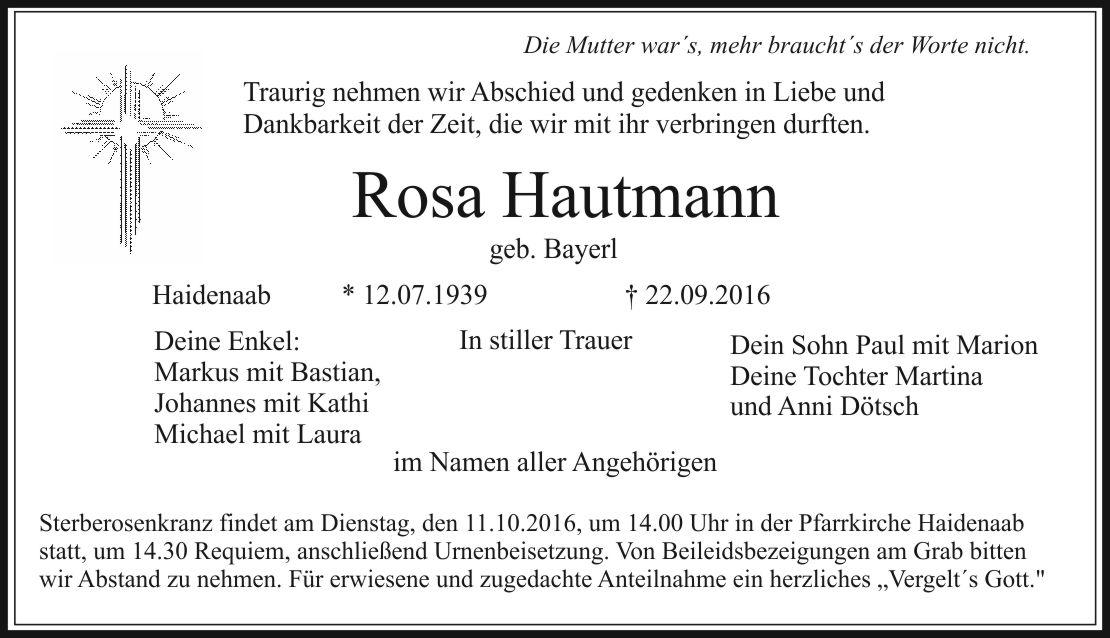 Sterberosenkranz findet am Dienstag, den 11.10.2016, um 14.00 Uhr in der Pfarrkirche Haidenaab statt, um 14.30 Uhr Requiem, anschließend Urnenbeisetzung. Von Beileidsbezeigungen am Grab bitten wir Abstand zu nehmen. Für erwiesene und zugedachte Anteilnahme ein herzliches "Vergelt´s Gott."