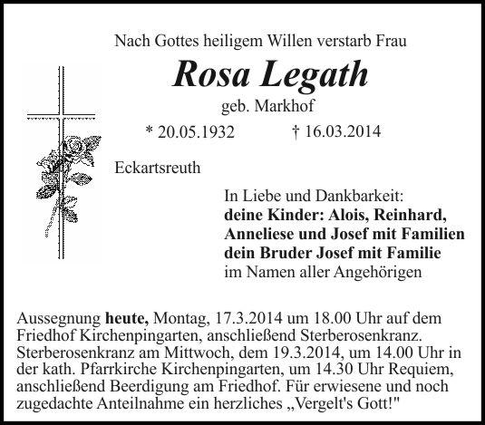 Aussegnung heute, Montag, 17.3.2014 um 18.00 Uhr auf dem Friedhof Kirchenpingarten, anschließend Sterberosenkranz. Sterberosenkranz am Mittwoch, dem 19.3.2014, um 14.00 Uhr in der kath. Pfarrkirche Kirchenpingarten, um 14.30 Uhr Requiem, anschließend Beerdigung am Friedhof. Für erwiesene und noch zugedachte Anteilnahme ein herzliches „Vergelt's Gott!"