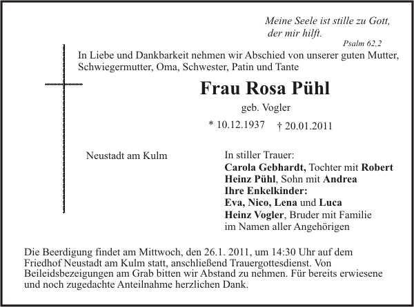 Die Beisetzung findet auf dem Friedhof in Friedhof in Neustadt am Kulm statt.