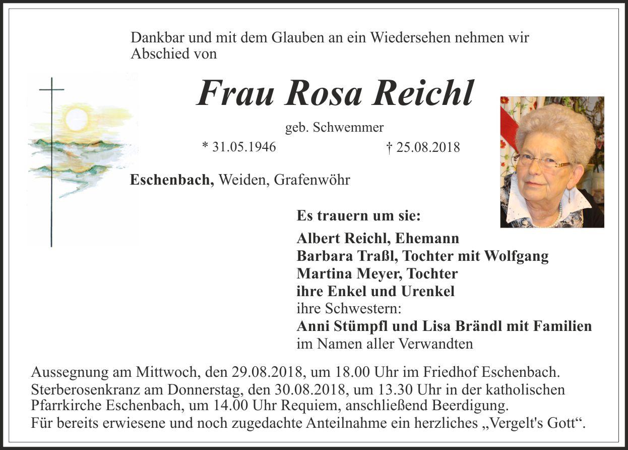 aussegnung am Mittwoch, den 29.08.2018, um 18.00 Uhr im Friedhof Eschenbach. Sterberosenkranz am Donnerstag, den 30.08.2018, um 13.30 uhr in der katholischen Pfarrkirche Eschenbach, um 14.00 Uhr Requiem, anschließend Beerdigung. Für alle Anteilnahme ein herzliches "Vergelt's Gott".