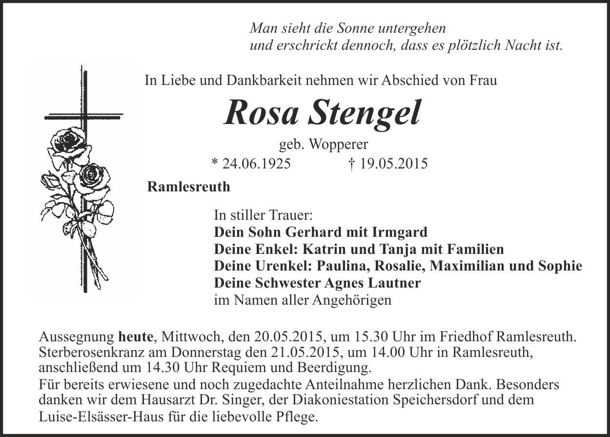 Aussegnung am Mittwoch, den 20.05.2015, um 15.30 Uhr im Friedhof Ramlesreuth. Sterberosenkranz am Donnerstag, den 21.05.2015, um 14.00 Uhr in Ramlesreuth, anschließend um 14.30 Uhr Requiem und Beerdigung. Für bereits erwiesene und noch zugedachte Anteilnahme herzlichen Dank.