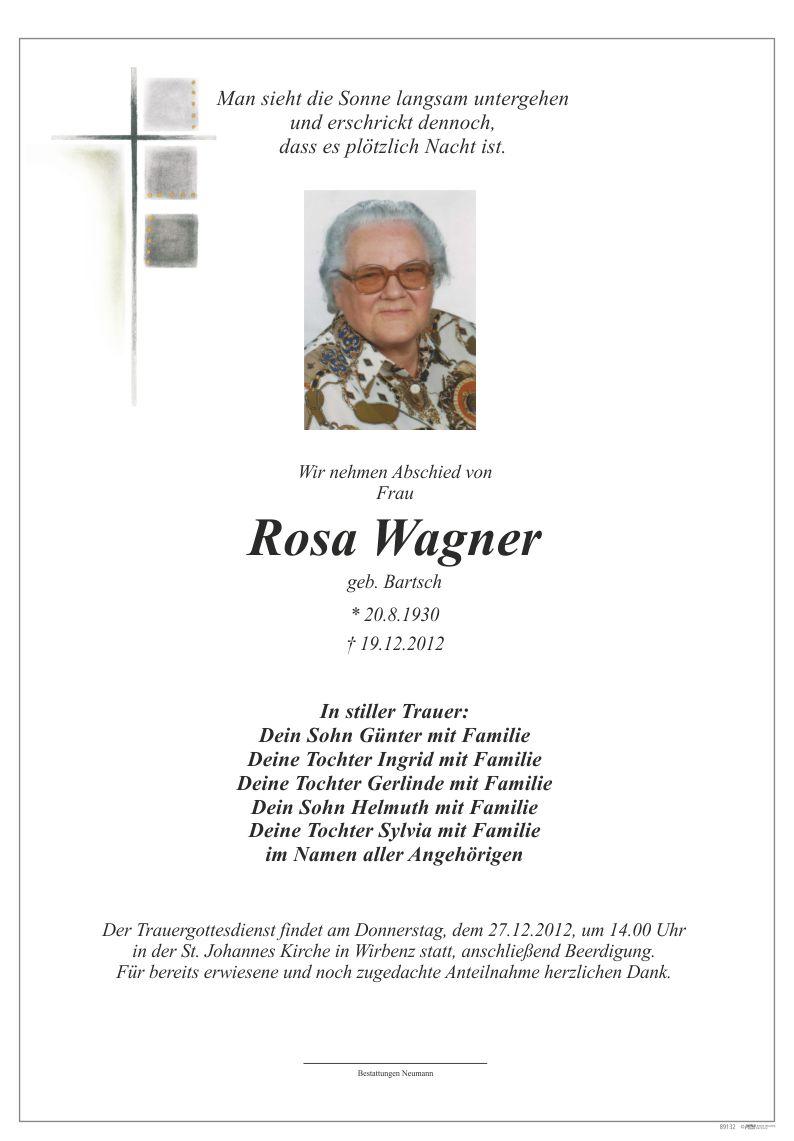 Der Trauergottesdienst findet am Donnerstag, dem 27.12.2012 um 14.00 Uhr in der St. Johannes Kirche in Wirbenz statt, anschließend Beerdigung. Für bereits erwiesene und zugedachte Anteilnahme herzlichen Dank.