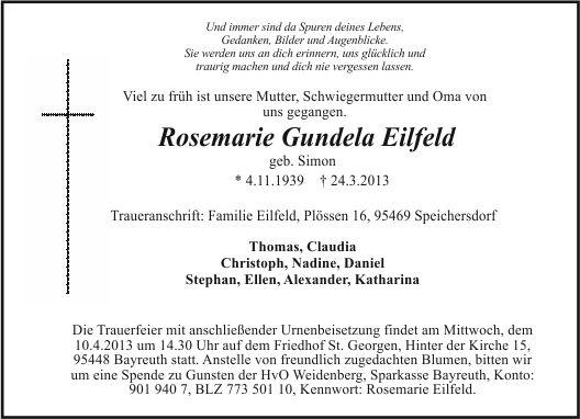 Die Trauerfeier mit anschließender Urnenbeisetzung findet am Mittwoch, dem 10.4.2013 um 14.30 Uhr auf dem Friedhof St. Georgen, Hinter der Kirche 15, 95448 Bayreuth statt. Anstelle von freundlich zugedachten Blumen, bitten wir um eine Spende zu Gunsten der HvO Weidenberg, Sparkasse Bayreuth, Konto: 901 940 7, BLZ 773 501 10, Kennwort: Rosemarie Eilfeld.