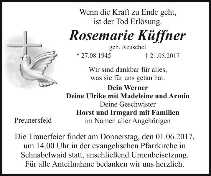 um 14.00 Uhr in der evangelischen Pfarrkirche in Schnabelwaid statt, anschließend Urnenbeisetzung.