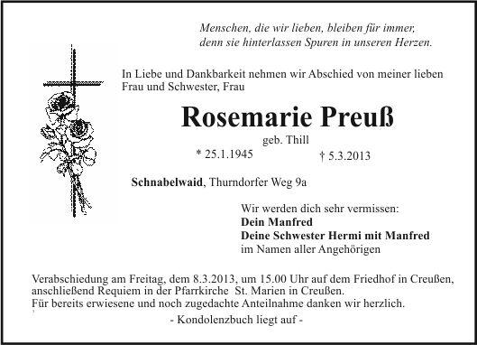 Verabschiedung am Freitag, dem 8.3.2013, um 15.00 Uhr auf dem Friedhof in Creußen, anschließend Requiem in der Pfarrkirche St. Marien in Creußen.