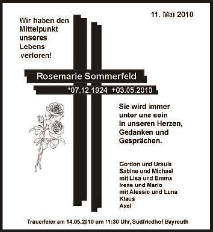 Die Beisetzung findet am Freitag, 14.05.2010 um 11:30 Uhr auf dem Friedhof Südfriedhof in Bayreuth statt.