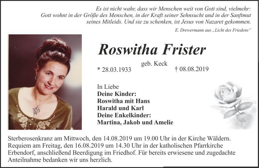Sterberosenkranz am Mittwoch, den 14.08.2019 um 19.00 Uhr in der Kirche Wäldern. Requiem am Freitag, den 16.08.2019 um 14.30 Uhr in der katholischen Pfarrkirche Erbendorf, anschließend Beerdigung im Friedhof. Für bereits erwiesene und zugedachte Anteilnahme bedanken wir uns herzlich.