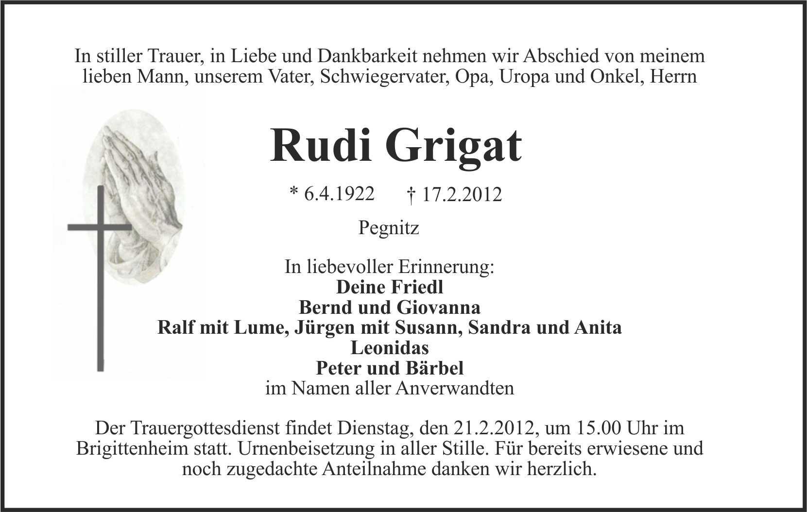 Der Trauergottedienst findet am Dienstag, dem 21.2.2012 um 15.00 Uhr im Brigittenheim Pegnitz statt. Urnenbeisetzung in aller Stille. Für erwiesene und noch zugedachte Anteilnahme danken wir herzlich.