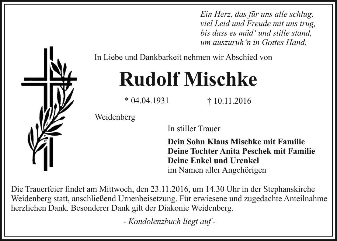 .Die Trauerfeier findet am Mittwoch, den 23.11.2016, um 14.30 Uhr in der Stephanskirche Weidenberg statt, anschließend Urnenbeisetzung. Für erwiesene und zugedachte Anteilnahme herzlichen Dank. Besonderer Dank gilt der Diakonie Weidenberg.