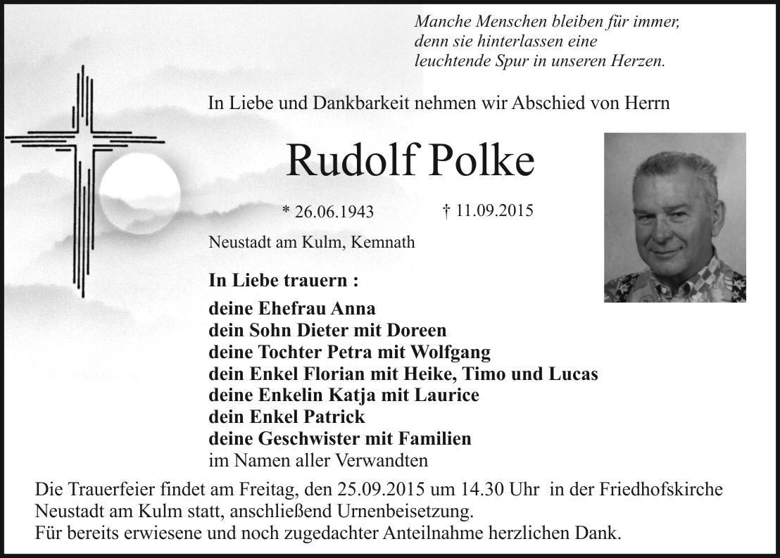 Die Trauerfeier findet am Freitag, den 25.09.2015 um 14.30 Uhr in der Friedhofskirche Neustadt am Kulm statt, anschließend Urnenbeisetzung.