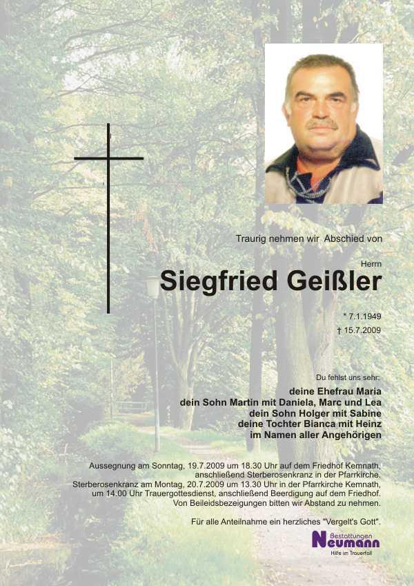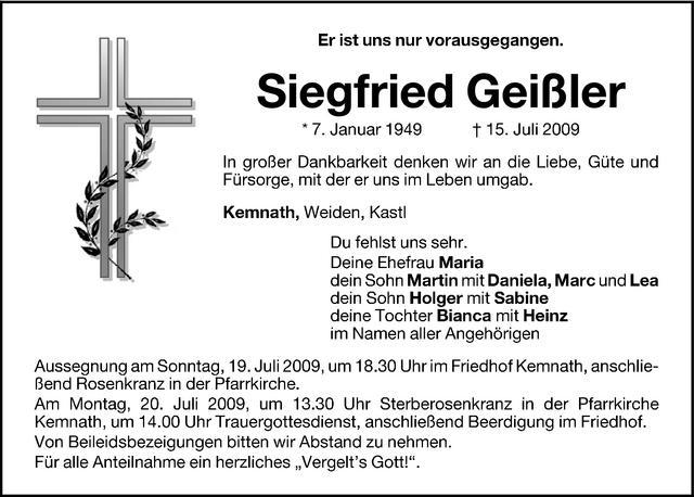 Sterberosenkranz am Montag, 20.7.2009 um 13.30 Uhr in der Pfarrkirche Kemnath, um 14.00 Uhr Trauergottesdienst, anschließend Beerdigung auf dem Friedhof.