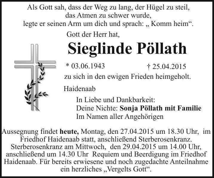 im Friedhof Haidenaab statt, anschließend Sterberosenkranz. Sterberosenkranz am Mittwoch, den 29.04.2015 um 14.00 Uhr, anschließend um 14.30 Uhr Requiem und Beerdigung im Friedhof Haidenaab. Für bereits erwiesene und noch zugedachte Anteilnahme ein herzliches „Vergelts Gott“.