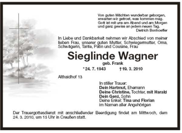 Die Beisetzung findet am Mittwoch, 24.03.2010 um 15:00 Uhr auf dem Friedhof in Creußen statt.