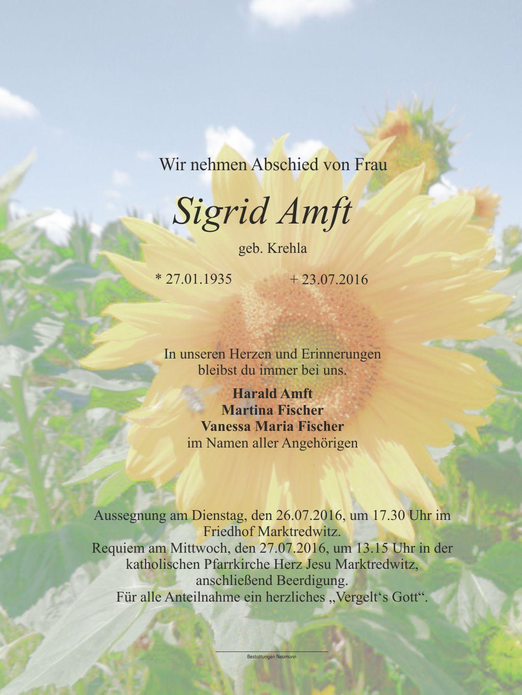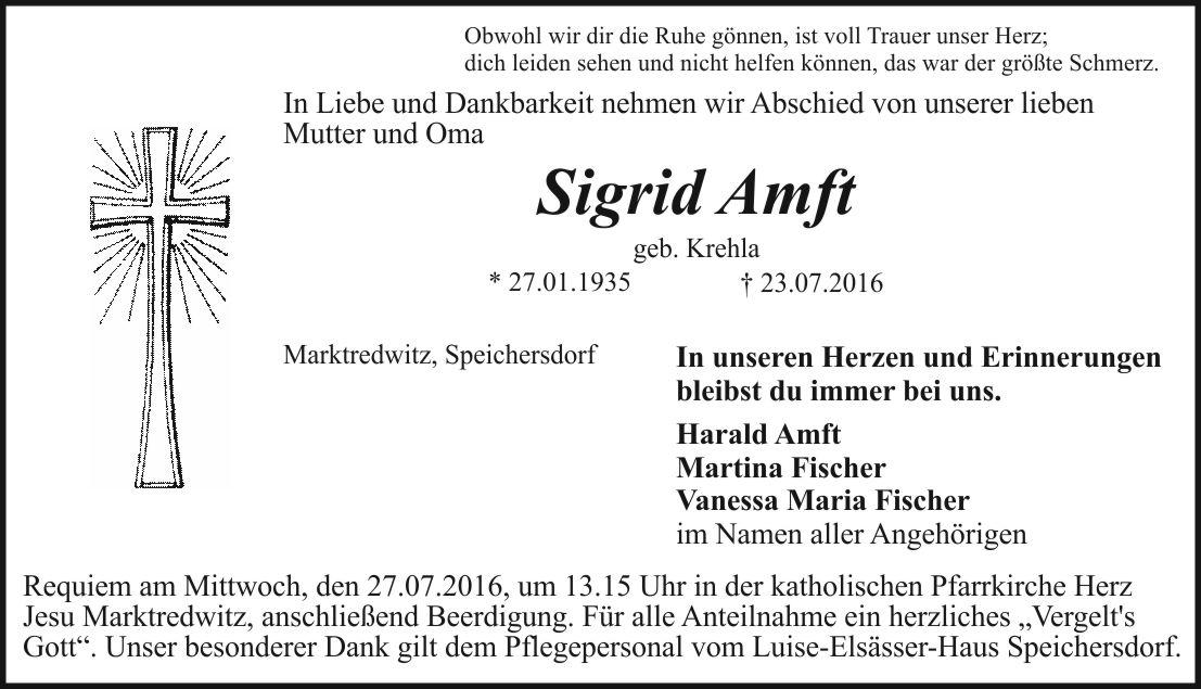 Requiem am Mittwoch, den 27.07.2016, um 13.15 Uhr in der katholischen Pfarrkirche Herz Jesu Marktredwitz, anschließend Beerdigung. Für alle Anteilnahme ein herzliches „Vergelt's Gott“. Unser besonderer Dank gilt dem Pflegepersonal vom Luise-Elsässer-Haus Speichersdorf.