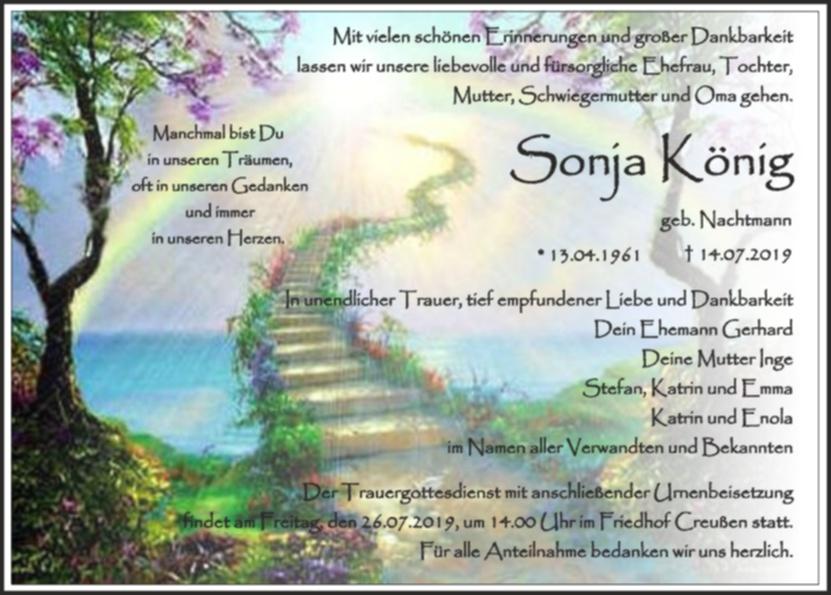 Der Trauergottesdienst findet am Freitag, den 26.07.2019, um 14.00 Uhr im Friedhof Creußen statt, anschließend Urnenbeisetzung. Für alle Anteilnahme bedanken wir uns herzlich.