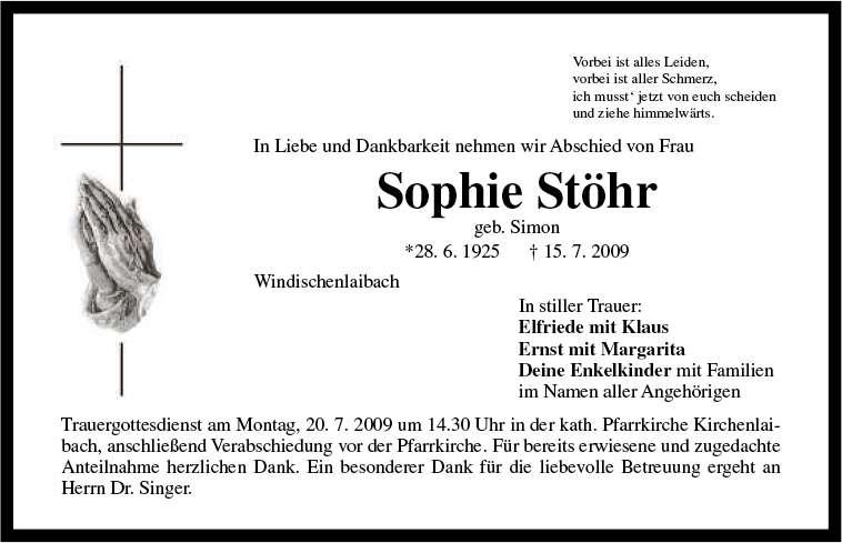 Trauergottesdienst am Montag, 20.7.2009 um 14.30 Uhr in der Kath. Pfarrkirche Kirchenlaibach, anschließend Verabschiedung vor der Pfarrkirche. Für bereits erwiesene und zugedachte Anteilnahme herzlichen Dank. Ein besonderer Dank für die liebevolle Betreuung ergeht an Herrn Dr. Singer.