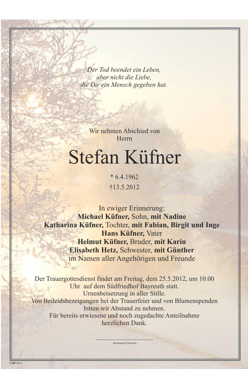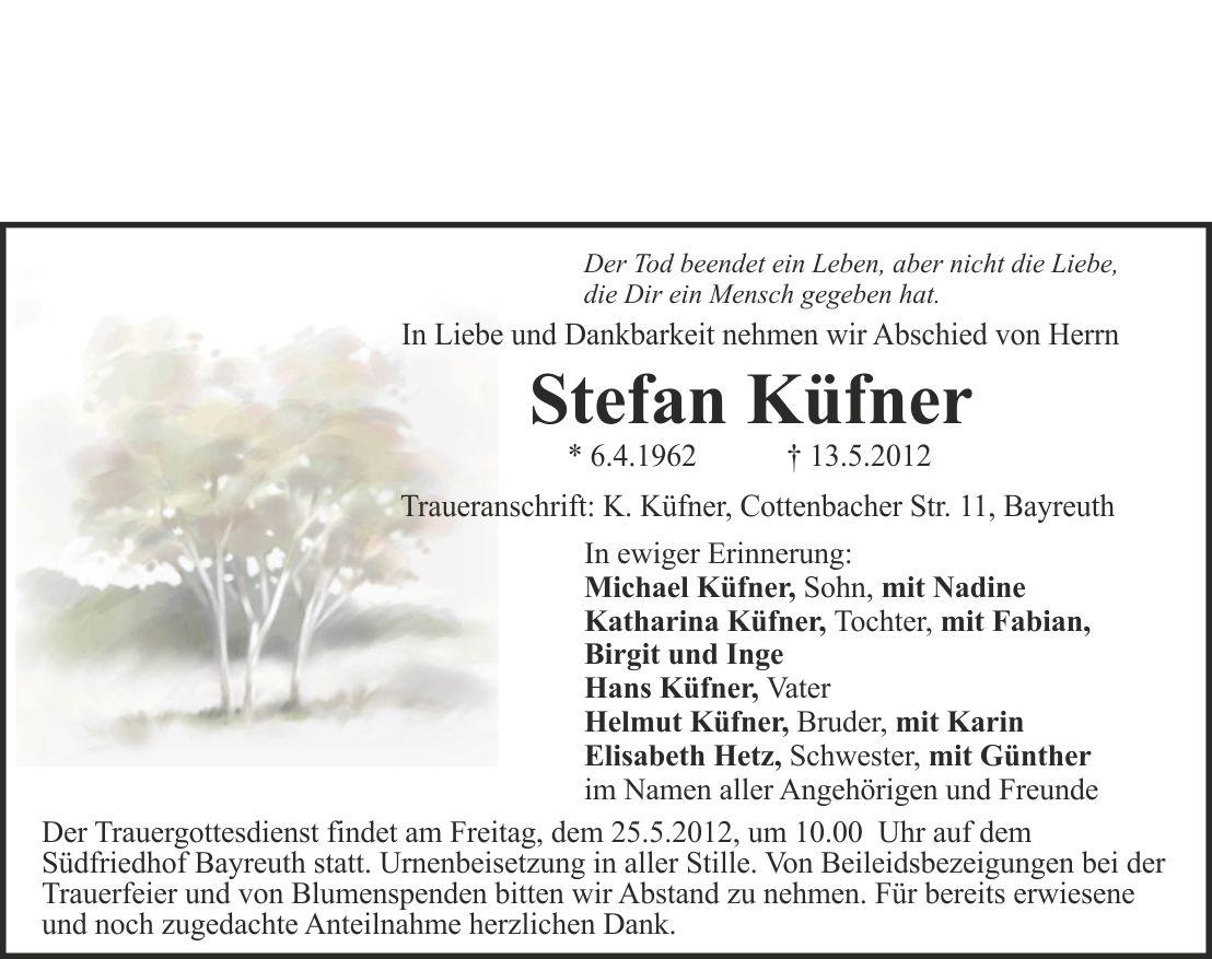 Der Trauergottesdienst findet Freitag, den 25.5.2012, um 10.00 Uhr im Südfriedhof Bayreuth statt. Urnenbeisetzung in aller Stille.
