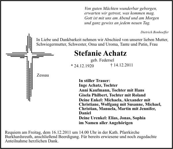 Der Trauergottesdienst findet Freitag, den 16.12.2011, um 14.00 Uhr in der kath. Pfarrkirche in Burkardsreuth statt, anschließend Beerdigung.