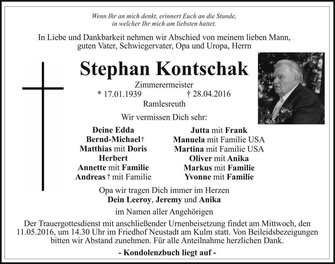 Der Trauergottesdienst mit anschließender Urnenbeisetzung findet am Mittwoch, den 11.05.2016, um 14.30 Uhr im Friedhof Neustadt am Kulm statt. Von Beileidsbezeigungen bitten wir Abstand zunehmen. Für alle Anteilnahme herzlichen Dank.
