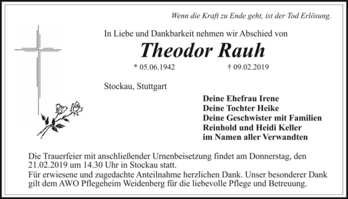 Die Trauerfeier mit anschließender Urnenbeisetzung findet am Donnerstag, den 21.02.2019 um 14.30 Uhr in Stockau statt.