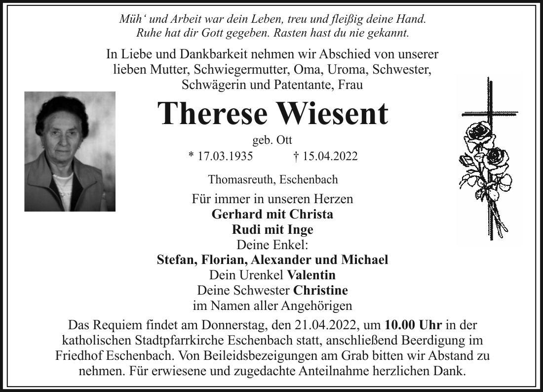 Das Requiem findet am Donnerstag, den 21.04.2022, um 10.00 Uhr in der katholischen Stadtpfarrkirche Eschenbach statt, anschließend Beerdigung im Friedhof Eschenbach. Von Beileidsbezeigungen am Grab bitten wir Abstand zu nehmen. Für erwiesene und zugedachte Anteilnahme herzlichen Dank.