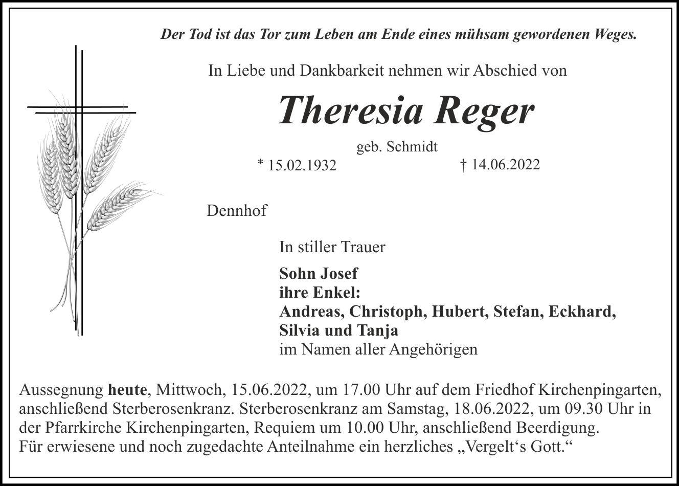 Aussegnung heute, Mittwoch, 15.06.2022, um 17.00 Uhr auf dem Friedhof Kirchenpingarten, anschließend Sterberosenkranz. Sterberosenkranz am Samstag, 18.06.2022, um 09.30 Uhr in der Pfarrkirche Kirchenpingarten, Requiem um 10.00 Uhr, anschließend Beerdigung.