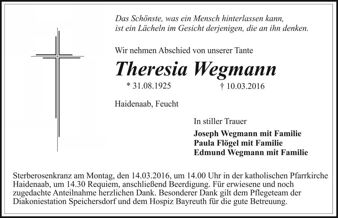 Aussegnung am Freitag, den 11.03.2016, um 18.00 Uhr in Haidennaab. Sterberosenkranz am Montag, den 14.03.2016, um 14.00 Uhr in der katholischen Pfarrkirche Haidenaab, um 14.30 Requiem, anschließend Beerdigung. Für erwiesene und noch zugedachte Anteilnahme herzlichen Dank. Besonderer Dank gilt dem Pflegeteam der Diakoniestation Speichersdorf und dem Hospiz Bayreuth für die gute Betreuung.
