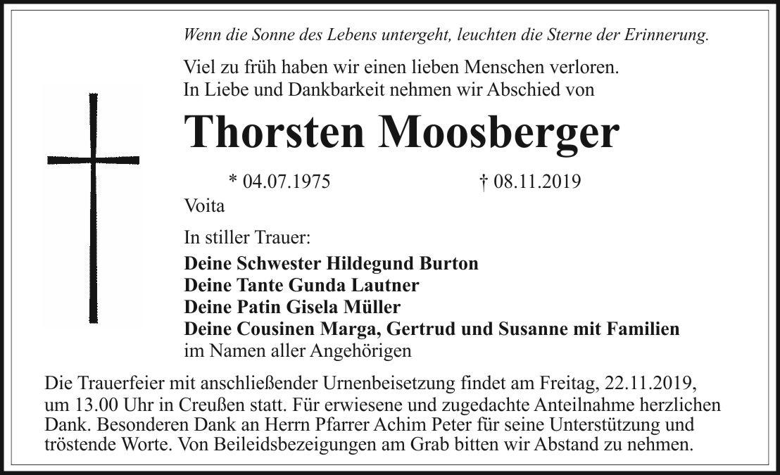 Die Trauerfeier mit anschließender Urnenbeisetzung findet am Freitag, 22.11.2019, um 13.00 Uhr in Creußen statt. Für erwiesene und zugedachte Anteilnahme herzlichen Dank. Besonderen Dank an Herrn Pfarrer Achim Peter für seine Unterstützung und tröstende Worte. Von Beileidsbezeigungen am Grab bitten wir Abstand zu nehmen.