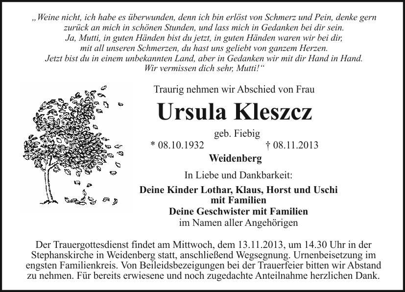 Der Trauergottesdienst findet am Mittwoch, dem 13.11.2013, um 14.30 Uhr in der Stephanskirche in Weidenberg statt, anschließend Wegsegnung. Urnenbeisetzung im engsten Familienkreis. Von Beileidsbezeigungen bei der Trauerfeier bitten wir Abstand zu nehmen. Für bereits erwiesene und noch zugedachte Anteilnahme herzlichen Dank