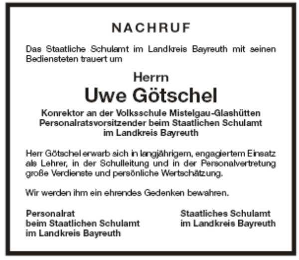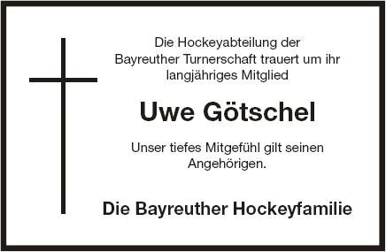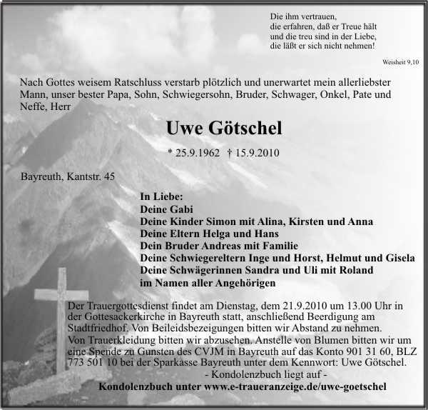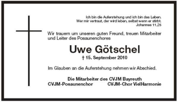 Von Trauerkleidung bitten wir abzusehen. Anstelle von Blumen bitten wir um eine Spende zu Gunsten des CVJM in Bayreuth auf das Konto: 9013160 BLZ: 77350110 bei der Sparkasse Bayreuth unter dem Kennwort: Uwe Götschel.
