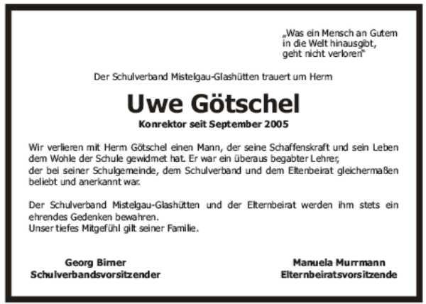 Liebe Familie Götschel, mit Bestürzen habe ich heute erfahren, dass Uwe verunglückt ist.