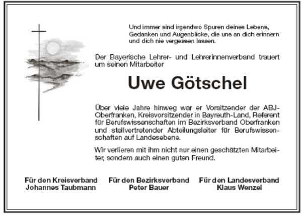 ich habe Uwe, den ich in der Schule in Pegnitz als einen sehr hilfsbereiten Kollegen kennen lernen durfte, wegen seiner ruhigen, gelassenen und doch sehr witzigen Art sehr gemocht. Deshalb war ich zutiefst geschockt, als ich von dem Unfall erfahren habe. Ich wünsche Ihnen von Herzen viel Kraft und Zuversicht. Denn: Ein Mensch, der uns verlässt, ist wie die Sonne, die versinkt. Aber etwas von ihrem Licht bleibt immer in unserem Herzen zurück.