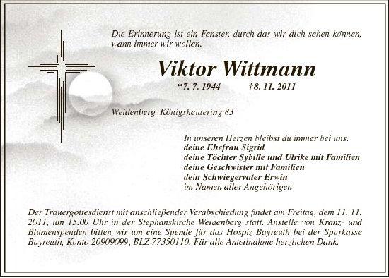 Der Trauergottesdienst mit anschließender Verabschiedung findet am Freitag, dem 11.11.2011, um 15.00 Uhr in der Stephanskirche Weidenberg statt.