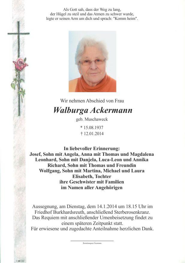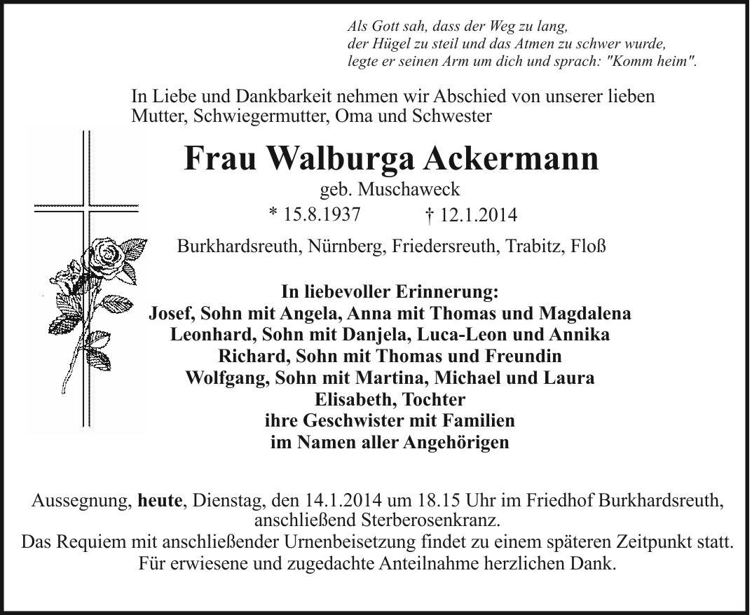 Die Beisetzung findet am Mittwoch, 29.01.2014 um 14:00 Uhr auf dem Friedhof in Burkhardsreuth statt.
