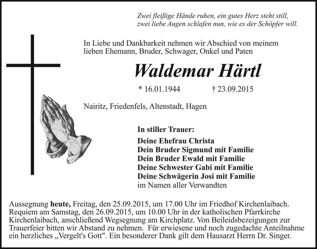 Aussegnung am Freitag, den 25.09.2015, um 17.00 Uhr im Friedhof Kirchenlaibach. Requiem am Samstag, den 26.09.2015, um 10.00 Uhr in der katholischen Pfarrkirche Kirchenlaibach, anschließend Wegsegnung am Kirchplatz. Von Beileidsbezeigungen zur Trauerfeier bitten wir Abstand zu nehmen. Für erwiesene und noch zugedachte Anteilnahme ein herzliches „Vergelt's Gott". Ein besonderer Dank gilt dem Hausarzt Herrn Dr. Singer.
