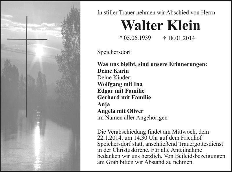 Die Verabschiedung findet am Mittwoch, dem 22.1.2014, um 14.30 Uhr auf dem Friedhof Speichersdorf statt, anschließend Trauergottesdienst in der Christuskirche. Für alle Anteilnahme bedanken wir uns herzlich. Von Beileidsbezeigungen am Grab bitten wir Abstand zu nehmen