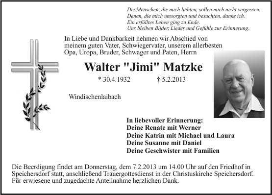 Die Beerdigung findet am Donnerstag, dem 7.2.2013 um 14.00 Uhr auf den Friedhof in Speichersdorf statt, anschließend Trauergottesdienst in der Christuskirche in Speichersdorf statt. Für erwiesene und zugedachte Anteilnahme herzlichen Dank.